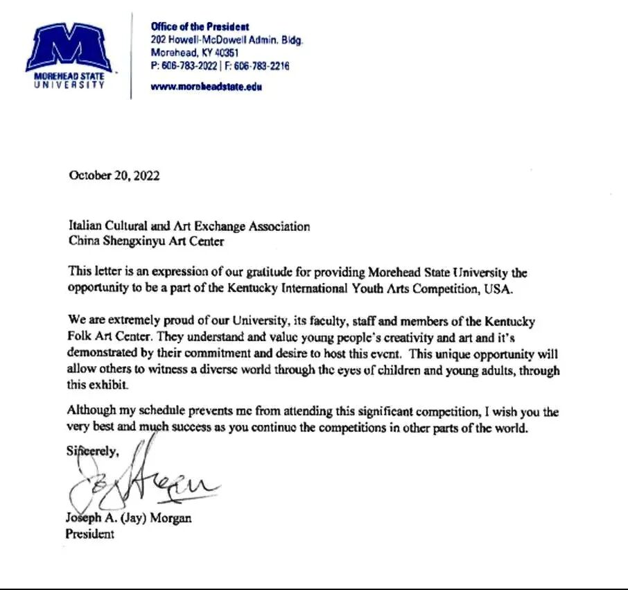 美国莫海德州立大学校长Dr. Jay Morgan为比赛亲笔贺信